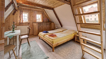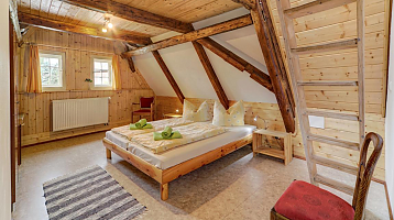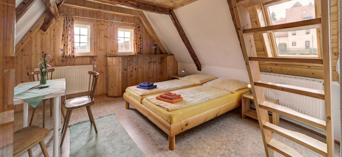Im Spitzboden ist ein zweites Doppelbett eingebaut, erreichbar über eine kleine Treppe.