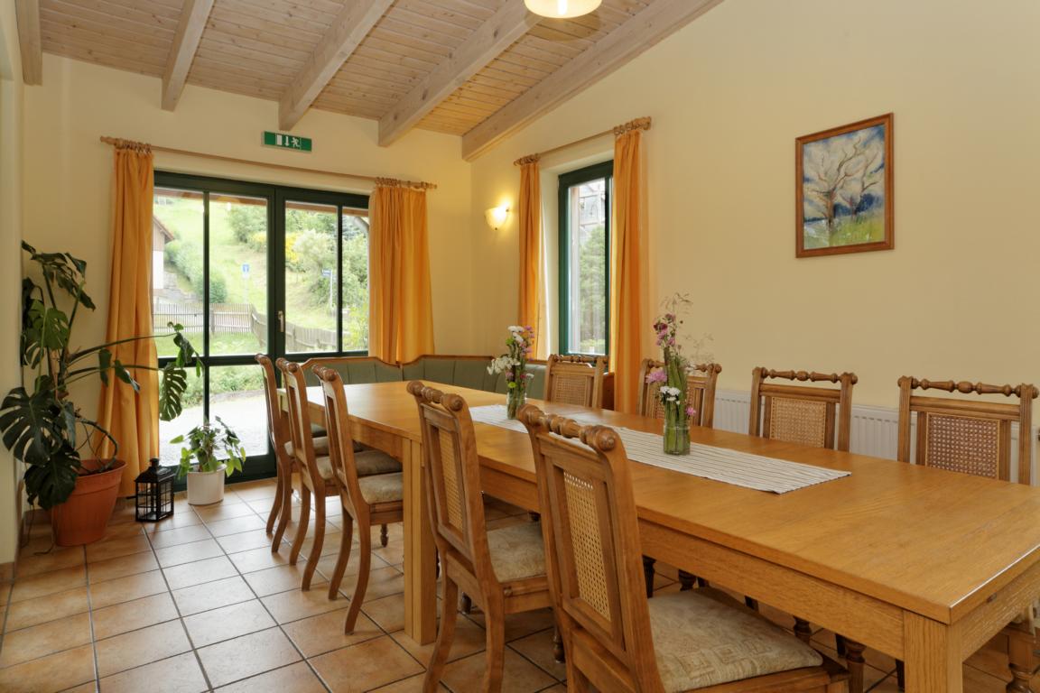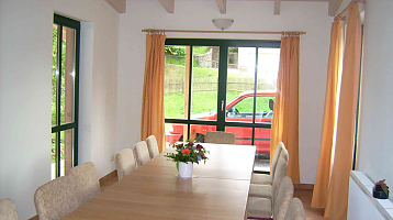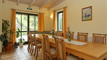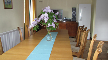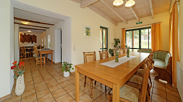 Im Aufenthaltsbereich befindet sich ein sehr großer Esstisch. Es gibt einen Fernseher mit Cinch-Anschluss (zum Abspielen von Musik von Laptop & Co. bitte passenden Adapter mitbringen), der an eine Lautsprecher-Anlage angeschlossen ist.