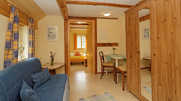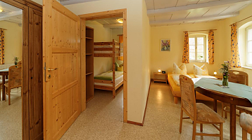 Wohneinheit 1 ist ausgestattet mit einem Doppelbett sowie einem Etagenbett im abgetrennten Schlafraum. Diese Wohneinheit ist behindertenfreundlich mit breiteren Türen, ohne Schwellen und mit ebenerdiger Dusche eingerichtet.