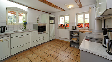 Die Küche ist komfortabel und ausreichend für alle Gäste des Hauses ausgestattet: Geschirr, Besteck, Gläser sowie u. a. Spülmaschine, zwei Kaffeemaschinen, Mikrowelle, Herd, Backofen, zwei Kühlschränke, Toaster, Wasserkocher. Es gibt (nach wiederholt zahlreichem Bruch) keine Wein- und Sektgläser.